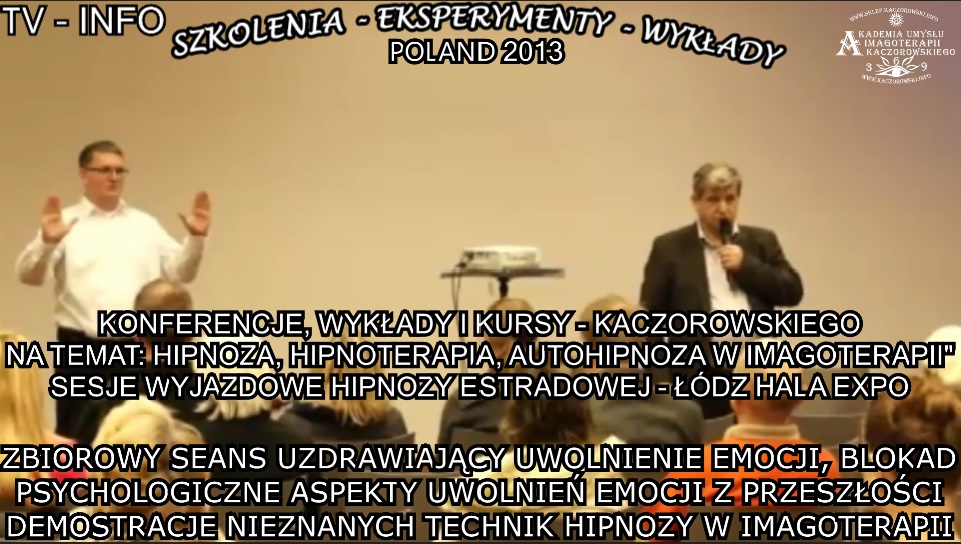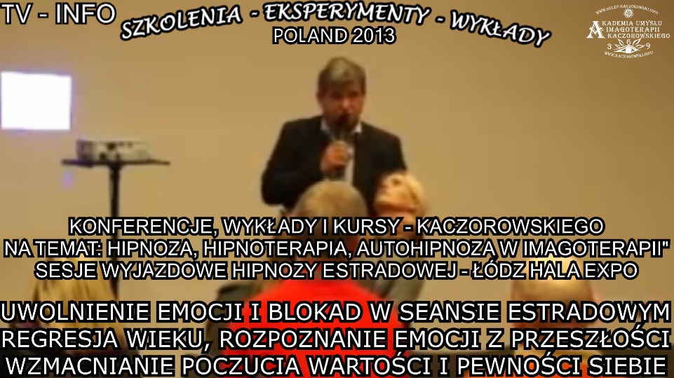 TV INFO 2013 ZBIOROWY SEANS UZDRAWIAJĄCY UWOLNIENIE EMOCJI, BLOKAD, PSYCHOLOGICZNE ASPEKTY UWOLNIEŃ EMOCJI Z PRZESZŁOSCI, DEMONSTRACJE NIEZNANYCH TECHNIK HIPNOZY W IMAGOTERAPII. KONFERENCJE,WYKŁADY I KURSY - KACZOROWSKIEGO NA TEMAT; HIPNOZA, HIPNOTERAPIA, AUTOHIPNOZA W IMAGOTERAPII. SESJE WYJAZDOWE HIPNOZY ESTRADOWEJ - ŁODZ HALA EXPO
