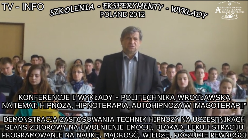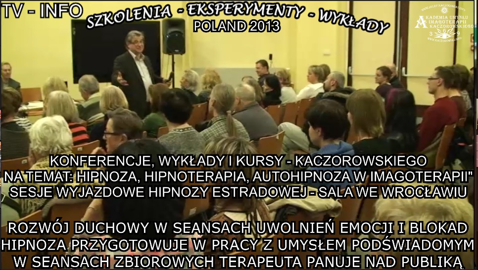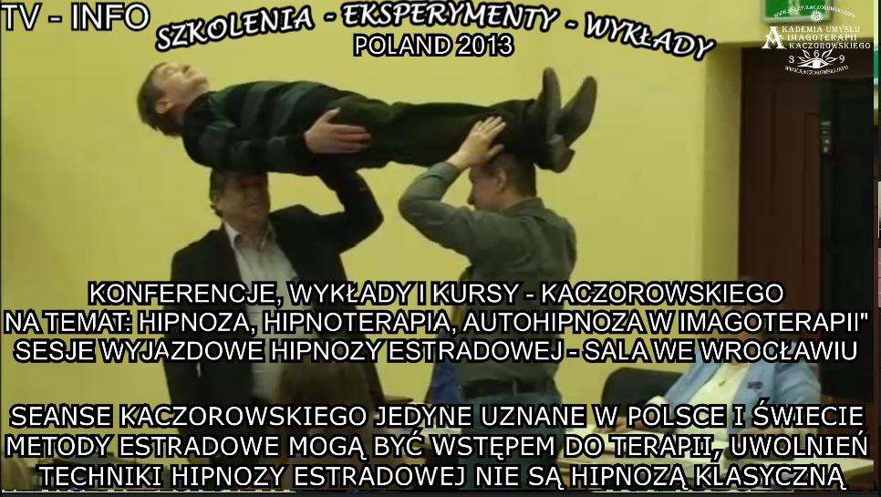 TV INFO 2013 SEANSE KACZOROWSKIEGO JEDYNE UZNANE W POLSCE I ŚWIECIE, METODY ESTRADOWE MOGĄ BYĆ WSTĘPEM DO TERAPII, UWOLNIEŃ, TECHNIKI HIPNOZY ESTRADOWEJ NIE SĄ HIPNOZĄ KLASYCZNĄ. KONFERENCJE, WYKŁADY I KURSY - KACZOROWSKIEGO NA TEMAT; HIPNOZA, HIPNOTERAPIA, AUTOHIPNOZA W IMAGOTERAPII. SESJE WYJAZDOWE HIPNOZY ESTRADOWEJ - SALA WE WROCŁAWIU