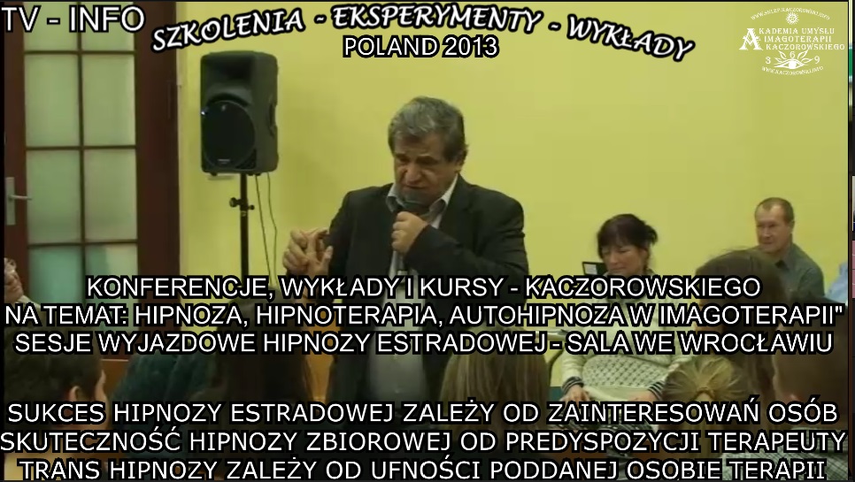 TV INFO 2013 SUKCES HIPNOZY ESTRADOWEJ ZALEZY OD ZAINTERESOWAŃ OSÓB, SKUTECZNOŚC HIPNOZY ZBIOROWEJ OD PREDYSPOZYCJI TERAPEUTY, TRANS HIPNOZY ZALEZY OD UFNOŚCI PODDANEJ OSOBIE TERAPII. KONFERENCJE, WYKŁADY I KURSY - KACZOROWSKIEGO NA TEMAT; HIPNOZA, HIPNOTERAPIA, AUTOHIPNZA W IMAGOTERAPII. SESJE WYJAZDOWE HIPNOZY ESTRADOWEJ - SALA WE WROCŁAWIU