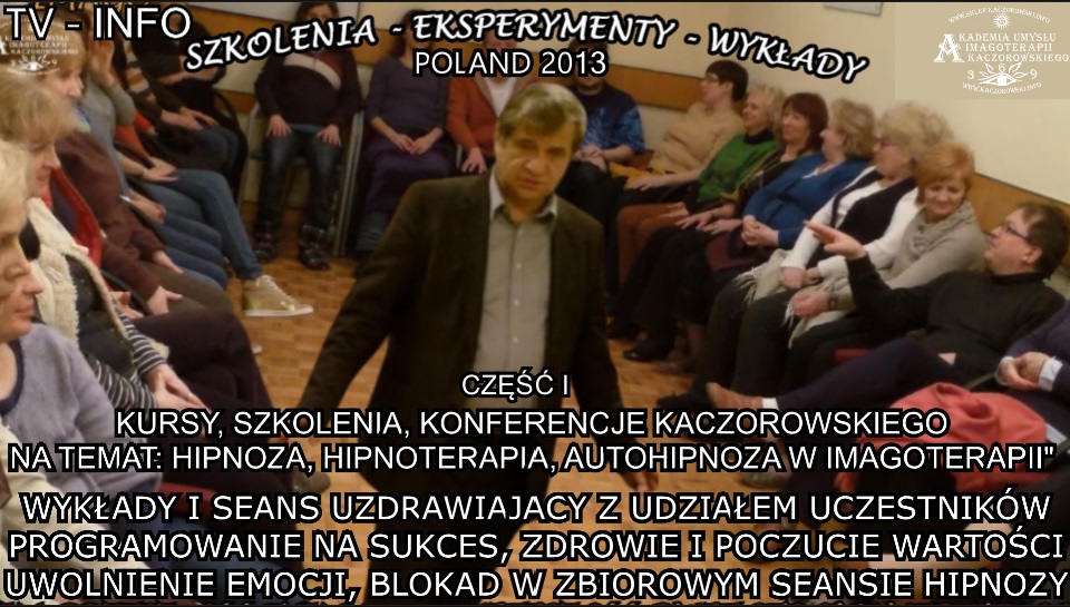 TV INFO 2013 WYKŁADY I SEANS UZDRAWIAJĄCY Z UDZIAŁEM UCZESTNIKÓW, PROGRAMOWANIE NA SUKCES, ZDROWIE I POCZUCIE WARTOŚCI,UWOLNIENIE EMOCJI, BLOKAD W ZBIOROWYM SEANSIE HIPNOZY. KURSY SZKOLENIA, KONFERENCJE KACZOROWSKIEGO NA TEMAT; HIPNOZA, HIPNOTERAPIA, AUTOHIPNOZA W IMAGOTERAPII