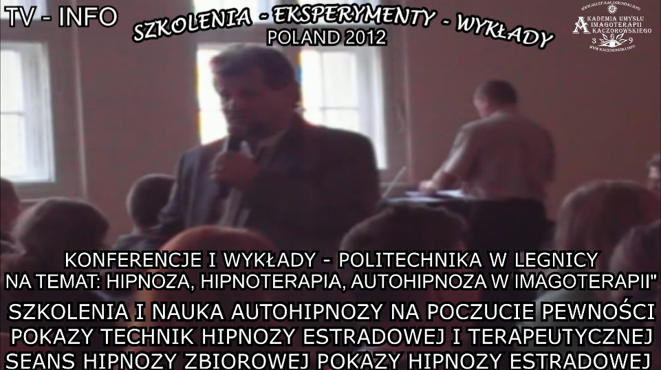 TV INFO 2012 SZKOLENIA NAUKA AUTOHIPNOZY NA POCZUCIE PEWNOSCI,POKAZY TECHNIKI HIPNOZY ESTRADOWEJ I TERAPEUTYCZNEJ. SEANS HIPNOZY ZBIOROWEJ POKAZY HIPNOZY ESTRADOWEJ. KONFERENCJE I WYKŁADY - POLITECHNIKA W LEGNICY NA TEMAT; HIPNOZA, HIPNOTERAPIA, AUTOHIPNOZA W IMAGOTERAPII