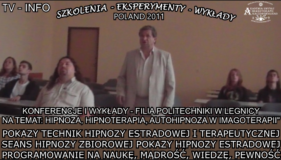 TV INFO 2011 POKAZY TECHNIK HIPNOZY ESTRADOWEJ I TERAPEUTYCZNEJ.SEANS HIPNOZY ZBIOROWEJ POKAZY HIPNOZY ESTRADOWEJ. PROGRAMOWANIE NA NAUKĘ, MĄDROŚC , WIEDZĘ, PEWNOŚC. KONFERENCJE I WYKŁADY - FILIA POLITECHNIKI W LEGNICY NA TEMAT; HIPNOZA, HIPNOTERAPIA, AUTOHIPNOZA W IMAGOTERAPII