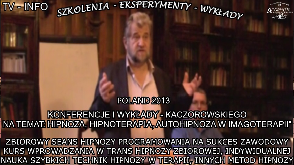 TV INFO 2013 ZBIOROWY SEANS HIPNOZY PROGRAMOWANIA NA SUKCES ZAWODOWY, KURS WPROWADZANIA W TRANS HIPNOZY ZBIOROWEJ, INDYWIDUALNEJ, NAUKA SZYBKICH TECHNIK HIPNOZY W TERAPII,INNYCH METOD HIPNOZY. KONFERENCJE I WYKŁADY - KACZOROWSKIEGO NA TEMAT; HIPNOZA, HIPNOTERAPIA, AUTOHIPNOZA W IMAGOTERAPII