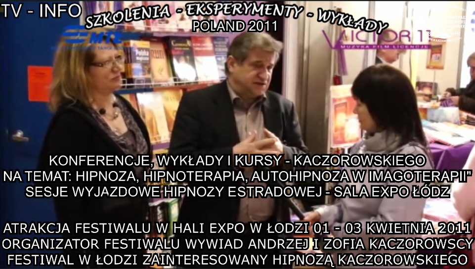 TV INFO 2011 ATRAKCJA FESTIWALU W HALI EXPO W ŁODZI 01-03 KWIETNIA 2011,ORGANIZATOR FESTIWALU WYWIAD ANDRZEJ I ZOFIA KACZOROWSCY FESTIWAL W ŁODZI ZAINTERESOWANY HIPNOZĄ KACZOROWSKIEGO. KONFERENCJE, WYKŁADY I KURSY - KACZOROWSKIEGO NA TEMAT; HIPNOZA, HIPNOTERAPIA, AUTOHIPNOZA W IMAGOTERAPII. SESJE WYJAZDOWE HIPNOZY ESTRADOWEJ - SALA EXPO ŁODZ 2011