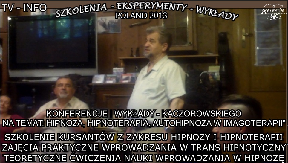 TV INFO 2013 SZKOLENIE KURSANTÓW Z ZAKRESU HIPNOZY I HIPNOTERAPII, ZAJĘCIA PRAKTYCZNE WPROWADZANIA W TRANS HIPNOTYCZNY, TEORETYCZNE ĆWICZENIA NAUKI WPROWADZANIA W HIPNOZĘ. KONFERENCJE I WYKŁADY - KACZOROWSKIEGO NA TEMAT; HIPNOZA, HIPNOTERAPIA, AUTOHIPNOZA W IMAGOTERAPII