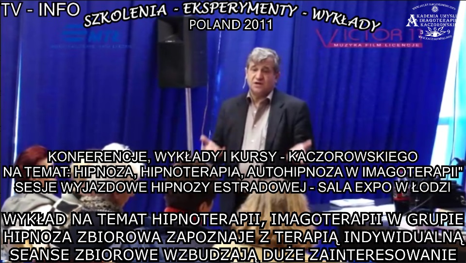 TV INFO 2011 WYKŁAD NA TEMAT HIPNOTERAPII,IMAGOTERAPII W GRUPIE,HIPNOZA ZBIOROWA ZAPOZNAJE Z TERAPIĄ INDYWIDUALNĄ, SEANSE ZBIOROWE WZBUDZAJĄ DUŻE ZAINTERESOWANIE. KONFERENCJE, WYKŁADY I KURSY - KACZOROWSKIEGO NA TEMAT; HIPNOZA, HIPNOTERAPIA, AUTOHIPNOZA W IMAGOTERAPII. SESJE WYJAZDOWE HIPNOZY ESTRADOWEJ - SALA EXPO W ŁODZI