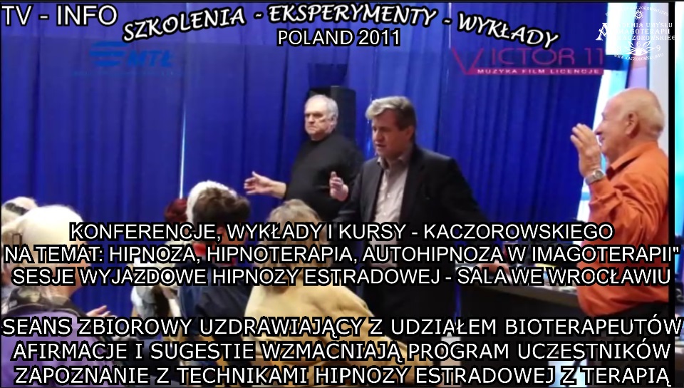TV INFO 2011 SEANS ZBIOROWY UZDRAWIAJĄCY Z UDZIAŁEM BIOTERAPEUTÓW,AFIRMACJE I SUGESTIE WZMACNIAJĄ PROGRAM UCZESTNIKÓW, ZAPOZNANIE Z TECHNIKAMI HIPNOZY ESTRADOWEJ Z TERAPIĄ. KONFERENCJE, WYKŁADY I KURSY - KACZOROWSKIEGO NA TEMAT; HIPNOZA, HIPNOTERAPIA, AUTOHIPNOZA W IMAGOTERAPII. SESJE WYJAZDOWE HIPNOZY ESTRADOWEJ - SALA WE WROCŁAWIU