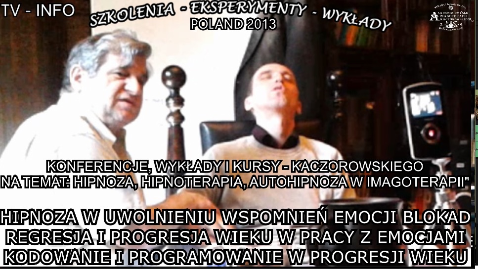 TV INFO 2013 HIPNOZA W UWOLNIENIU WSPOMNIEŃ EMOCJI BLOKAD,REGRESJA I PROGRESJA WIEKU W PRACY Z EMOCJAMI, KODOWANIE I PROGRAMOWANIE W PROGRESJI WIEKU. KONFERENCJE, WYKŁADY I KURSY - KACZOROWSKIEGO NA TEMAT; HIPNZOA, HIPNOTERAPIA, AUTOHIPNOZA W IMAGOTERAPII